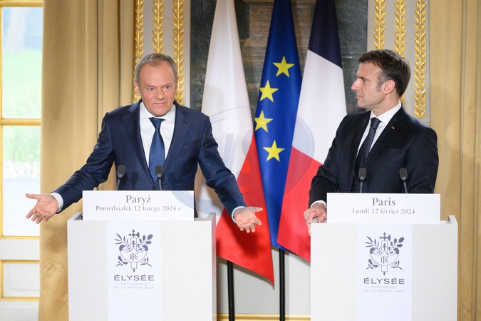 Le président de la République française Emmanuel Macron et le Premier ministre polonais Donald Tusk lors d'une conférence de presse commune au palais présidentiel de l'Elysée à Paris, France, le 12 février 2024. © Jacques Witt/Pool/Bestimage Donald Dusk and Emmanuel Macron. French President Emmanuel Macron and Polish Prime Minister Donald Tusk during a press conference at Elysee Palace, in Paris, France, on February 12, 2024.