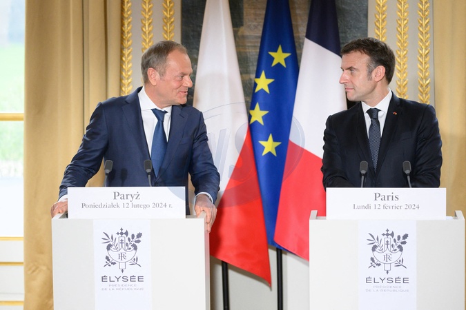 Le président de la République française Emmanuel Macron et le Premier ministre polonais Donald Tusk lors d'une conférence de presse commune au palais présidentiel de l'Elysée à Paris, France, le 12 février 2024. © Jacques Witt/Pool/Bestimage Donald Dusk and Emmanuel Macron. French President Emmanuel Macron and Polish Prime Minister Donald Tusk during a press conference at Elysee Palace, in Paris, France, on February 12, 2024.