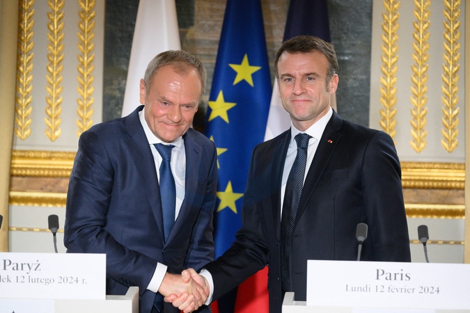Le président de la République française Emmanuel Macron et le Premier ministre polonais Donald Tusk lors d'une conférence de presse commune au palais présidentiel de l'Elysée à Paris, France, le 12 février 2024. © Jacques Witt/Pool/Bestimage Donald Dusk and Emmanuel Macron. French President Emmanuel Macron and Polish Prime Minister Donald Tusk during a press conference at Elysee Palace, in Paris, France, on February 12, 2024.