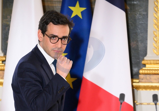 Stéphane Séjourné, ministre de l'Europe et des Affaires étrangères - Le président de la République française et le Premier ministre polonais lors d'une conférence de presse commune au palais présidentiel de l'Elysée à Paris, France, le 12 février 2024. © Jacques Witt/Pool/Bestimage French Foreign and European Affairs Minister Stephane Sejourne - French President and Polish Prime Minister during a press conference at Elysee Palace, in Paris, France, on February 12, 2024.
