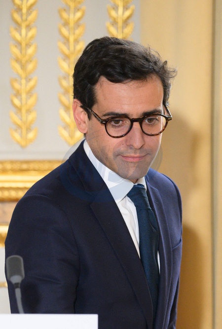 Stéphane Séjourné, ministre de l'Europe et des Affaires étrangères - Le président de la République française et le Premier ministre polonais lors d'une conférence de presse commune au palais présidentiel de l'Elysée à Paris, France, le 12 février 2024. © Jacques Witt/Pool/Bestimage French Foreign and European Affairs Minister Stephane Sejourne - French President and Polish Prime Minister during a press conference at Elysee Palace, in Paris, France, on February 12, 2024.