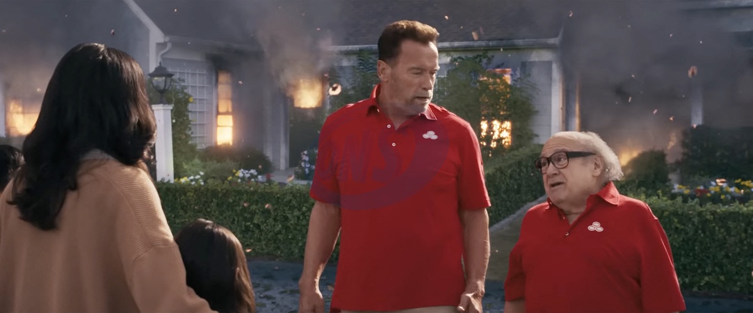 Pictures MUST credit: State Farm Arnold Schwarzenegger is reunited with his Twins movie co-star Danny DeVito who comes to the rescue in a stunt-loaded commercial. The tongue-in-cheek ad, for US insurance company State Farm, was part two of a couple of ads made for broadcasting during Sunday's Super Bowl. The first commercial, shown a few days prior, involved Austrian-born Terminator star Arnie, 76, attempting to say , "like a good neighbour, State Farm is there.” But instead of saying the word "neighbour” ,his accent means that each time he pronounces it "neigh-baaa” The director and a set assistant keep trying to help Arnie with his pronunciation. The ad ends with the director handing him a script which has a change. The new script version of the commercial aired during the Super Bowl. As Arnie was about to tell a woman , whose puppies he rescued from a house fire, that "like a good neighbour, State Farm is there”, DeVito ,79, is at his side. Before Arnie can get the words out, DeVito says them instead, pronouncing "neighbour” correctly. Picture supplied by JLPPA