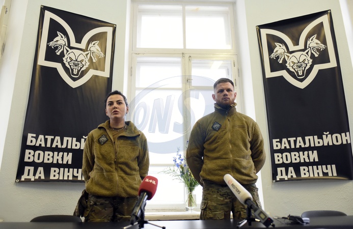 KYIV, UKRAINE - FEBRUARY 10, 2024 - Head of the Ulf Medical Service of the Da Vinci Wolves Battalion Alina Mykhailova (L) and Commander of the Da Vinci Wolves Battalion Serhii Filimonov attend a briefing during the opening of the battalion's first recruitment centre in Kyiv, capital of Ukraine., Credit:Ruslan Kaniuka / Avalon