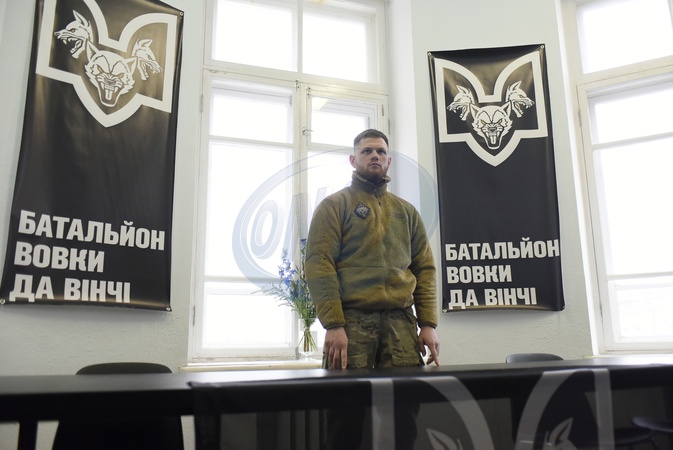 KYIV, UKRAINE - FEBRUARY 10, 2024 - Commander of the Da Vinci Wolves Battalion Serhii Filimonov attends a briefing during the opening of the battalion's first recruitment centre in Kyiv, capital of Ukraine., Credit:Ruslan Kaniuka / Avalon