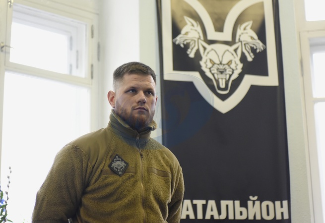 KYIV, UKRAINE - FEBRUARY 10, 2024 - Commander of the Da Vinci Wolves Battalion Serhii Filimonov attends a briefing during the opening of the battalion's first recruitment centre in Kyiv, capital of Ukraine., Credit:Ruslan Kaniuka / Avalon