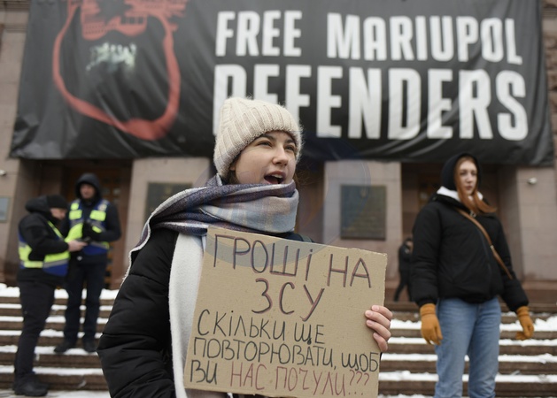 KYIV, UKRAINE - FEBRUARY 10, 2024 - Demonstrators demand that more funds should be allocated in Kyiv's budget for the military and procurement of armament during the Money for AFU (Armed Forces of Ukraine) rally at the Kyiv City State Administration building, Kyiv, capital of Ukraine., Credit:Ruslan Kaniuka / Avalon