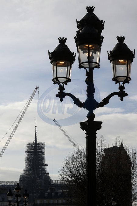 Illustration de la flèche et du coq de la cathédrale de Notre Dame de Paris libérée des échafaudages. Paris, le 13 février 2024. © Stéphane Lemouton / Bestimage Illustration of the spire and rooster of the cathedral of Notre Dame de Paris freed from scaffolding. Paris, February 13, 2024.