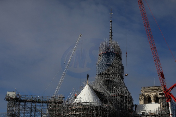 Illustration de la flèche et du coq de la cathédrale de Notre Dame de Paris libérée des échafaudages. Paris, le 13 février 2024. © Stéphane Lemouton / Bestimage Illustration of the spire and rooster of the cathedral of Notre Dame de Paris freed from scaffolding. Paris, February 13, 2024.