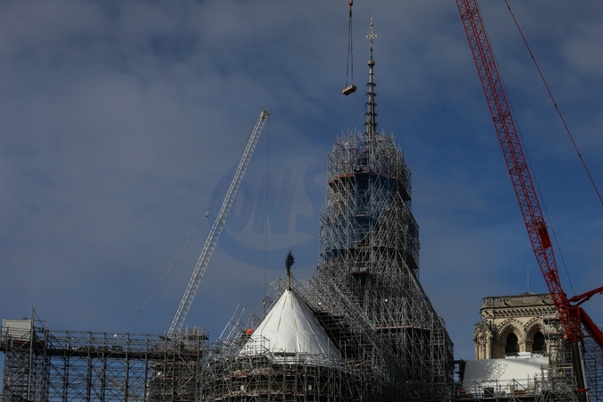 Illustration de la flèche et du coq de la cathédrale de Notre Dame de Paris libérée des échafaudages. Paris, le 13 février 2024. © Stéphane Lemouton / Bestimage Illustration of the spire and rooster of the cathedral of Notre Dame de Paris freed from scaffolding. Paris, February 13, 2024.