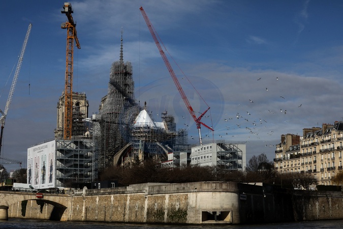 Illustration de la flèche et du coq de la cathédrale de Notre Dame de Paris libérée des échafaudages. Paris, le 13 février 2024. © Stéphane Lemouton / Bestimage Illustration of the spire and rooster of the cathedral of Notre Dame de Paris freed from scaffolding. Paris, February 13, 2024.