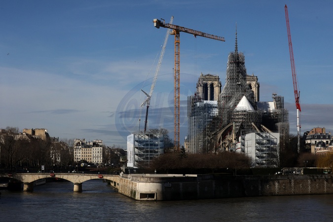 Illustration de la flèche et du coq de la cathédrale de Notre Dame de Paris libérée des échafaudages. Paris, le 13 février 2024. © Stéphane Lemouton / Bestimage Illustration of the spire and rooster of the cathedral of Notre Dame de Paris freed from scaffolding. Paris, February 13, 2024.
