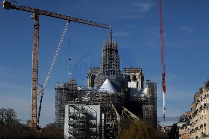Illustration de la flèche et du coq de la cathédrale de Notre Dame de Paris libérée des échafaudages. Paris, le 13 février 2024. © Stéphane Lemouton / Bestimage Illustration of the spire and rooster of the cathedral of Notre Dame de Paris freed from scaffolding. Paris, February 13, 2024.