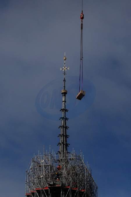 Illustration de la flèche et du coq de la cathédrale de Notre Dame de Paris libérée des échafaudages. Paris, le 13 février 2024. © Stéphane Lemouton / Bestimage Illustration of the spire and rooster of the cathedral of Notre Dame de Paris freed from scaffolding. Paris, February 13, 2024.