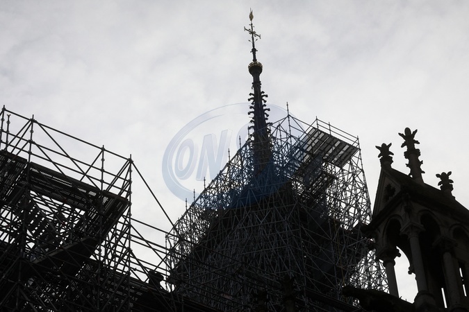 Illustration de la flèche et du coq de la cathédrale de Notre Dame de Paris libérée des échafaudages. Paris, le 13 février 2024. © Stéphane Lemouton / Bestimage Illustration of the spire and rooster of the cathedral of Notre Dame de Paris freed from scaffolding. Paris, February 13, 2024.