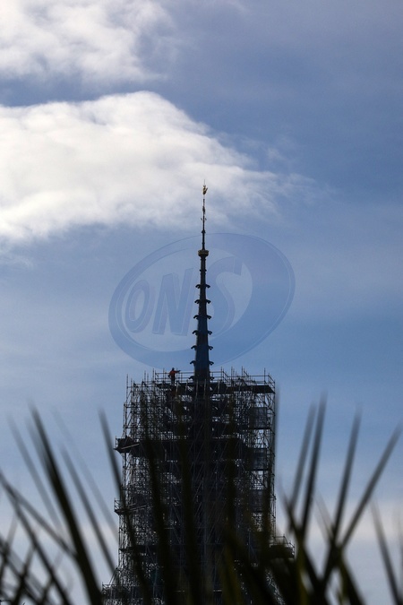 Illustration de la flèche et du coq de la cathédrale de Notre Dame de Paris libérée des échafaudages. Paris, le 13 février 2024. © Stéphane Lemouton / Bestimage Illustration of the spire and rooster of the cathedral of Notre Dame de Paris freed from scaffolding. Paris, February 13, 2024.