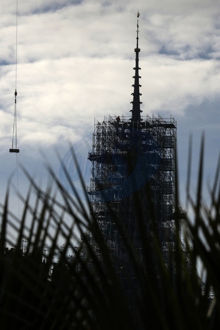 Illustration de la flèche et du coq de la cathédrale de Notre Dame de Paris libérée des échafaudages. Paris, le 13 février 2024. © Stéphane Lemouton / Bestimage Illustration of the spire and rooster of the cathedral of Notre Dame de Paris freed from scaffolding. Paris, February 13, 2024.