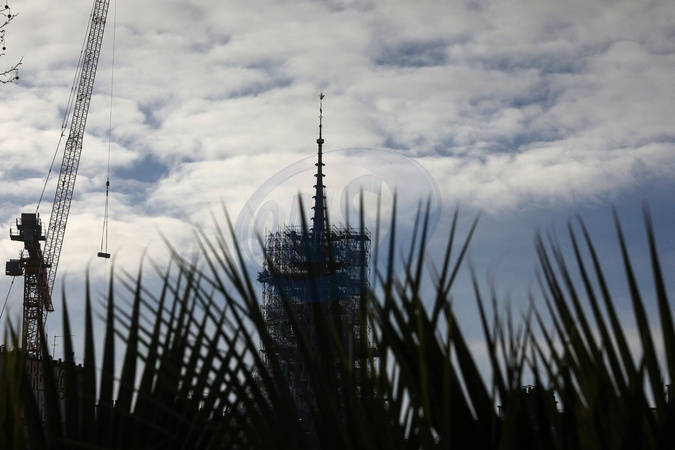 Illustration de la flèche et du coq de la cathédrale de Notre Dame de Paris libérée des échafaudages. Paris, le 13 février 2024. © Stéphane Lemouton / Bestimage Illustration of the spire and rooster of the cathedral of Notre Dame de Paris freed from scaffolding. Paris, February 13, 2024.