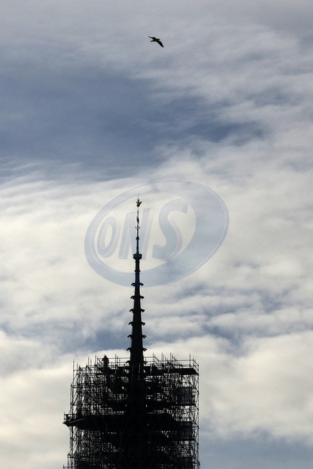 Illustration de la flèche et du coq de la cathédrale de Notre Dame de Paris libérée des échafaudages. Paris, le 13 février 2024. © Stéphane Lemouton / Bestimage Illustration of the spire and rooster of the cathedral of Notre Dame de Paris freed from scaffolding. Paris, February 13, 2024.