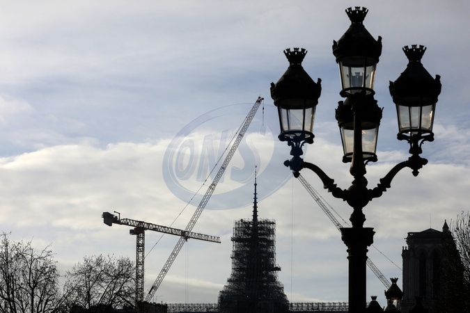 Illustration de la flèche et du coq de la cathédrale de Notre Dame de Paris libérée des échafaudages. Paris, le 13 février 2024. © Stéphane Lemouton / Bestimage Illustration of the spire and rooster of the cathedral of Notre Dame de Paris freed from scaffolding. Paris, February 13, 2024.