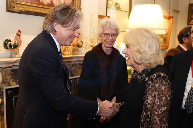 Queen Camilla greets fashion designer Stewart Parvin ahead of a ceremony at Clarence House, central London, where she will be installed as an Honorary Liveryman of the Worshipful Company of Fan Makers. Picture date: Tuesday February 13, 2024., Credit:Jordan Pettitt / Avalon