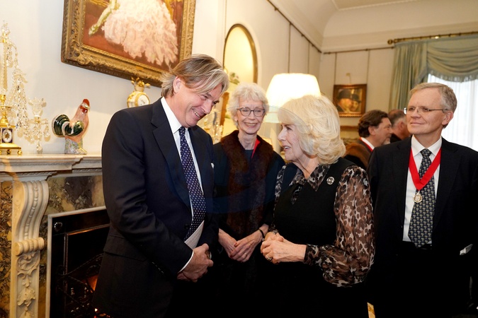 Queen Camilla greets fashion designer Stewart Parvin ahead of a ceremony at Clarence House, central London, where she will be installed as an Honorary Liveryman of the Worshipful Company of Fan Makers. Picture date: Tuesday February 13, 2024., Credit:Jordan Pettitt / Avalon