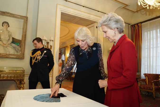 Queen Camilla and the Duchess of Gloucester observe a fan ahead of a ceremony at Clarence House, central London, where Queen Camilla will be installed as an Honorary Liveryman of the Worshipful Company of Fan Makers.Picture date: Tuesday February 13, 2024., Credit:Jordan Pettitt / Avalon