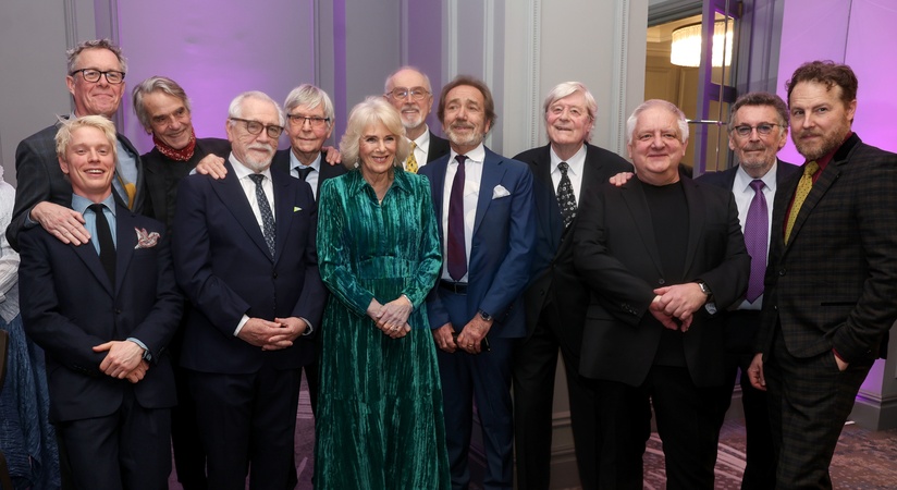 LONDON, ENGLAND - FEBRUARY 14: Queen Camilla (C) smiles as she poses with (L-R) Alex Jennings, Freddie Fox, Jeremy Irons, Brian Cox, Tom Courtenay, Peter Egan, Robert Lindsay, Martin Jarvis, Simon Russell Beale, Robert Powell and Samuel West at the "Celebration Of Shakespeare" at Grosvenor House on February 14, 2024 in London, England., Credit:Chris Jackson / Avalon