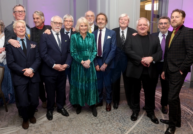 LONDON, ENGLAND - FEBRUARY 14: Queen Camilla (C) smiles as she poses with (L-R) Alex Jennings, Freddie Fox, Jeremy Irons, Brian Cox, Tom Courtenay, Peter Egan, Robert Lindsay, Martin Jarvis, Simon Russell Beale, Robert Powell and Samuel West at the "Celebration Of Shakespeare" at Grosvenor House on February 14, 2024 in London, England., Credit:Chris Jackson / Avalon