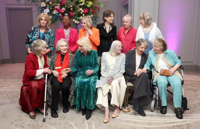 LONDON, ENGLAND - FEBRUARY 14: Queen Camilla (front row third left) with Dames (L-R back row) Joanna Lumley, Floella Benjamin, Twiggy Lawson, Harriet Walter, Penelope Wilton, Maureen Lipman (L-R front row) Virginia McKenna, Siân Phillips, Vanessa Redgrave, Penelope Keith and Patricia Routledge at the "Celebration Of Shakespeare" at Grosvenor House on February 14, 2024 in London, England., Credit:Chris Jackson / Avalon