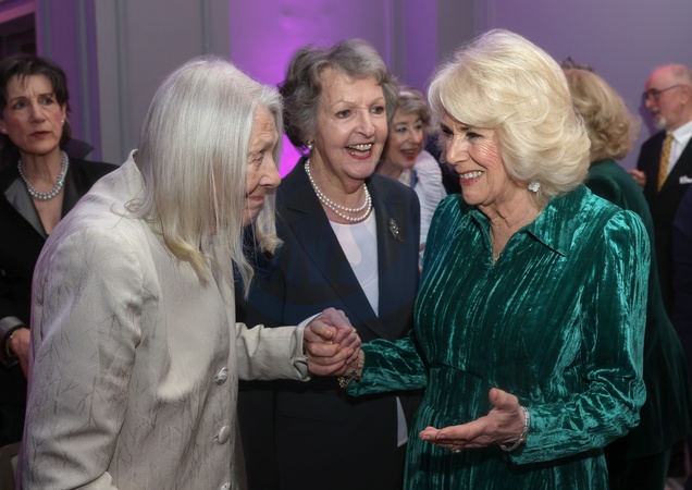 LONDON, ENGLAND - FEBRUARY 14: Queen Camilla smiles as she holds hands with Dame Vanessa Redgrave (L) with Dame Penelope Keith (C) as she attends the "Celebration Of Shakespeare" at Grosvenor House on February 14, 2024 in London, England., Credit:Chris Jackson / Avalon