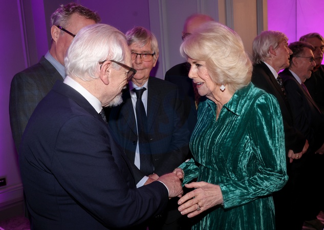 LONDON, ENGLAND - FEBRUARY 14: Queen Camilla smiles as she shakes hands with Brian Cox (L) at the "Celebration Of Shakespeare" at Grosvenor House on February 14, 2024 in London, England., Credit:Chris Jackson / Avalon