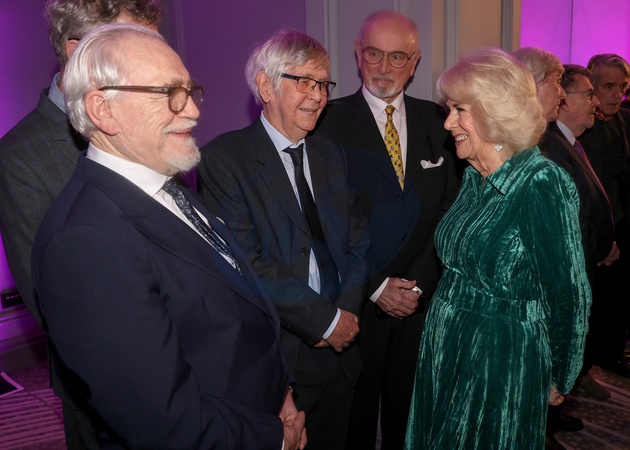 LONDON, ENGLAND - FEBRUARY 14: Queen Camilla laughs as she speaks with (L-R) Brian Cox, Tom Courtenay, Peter Egan at the "Celebration Of Shakespeare" at Grosvenor House on February 14, 2024 in London, England., Credit:Chris Jackson / Avalon