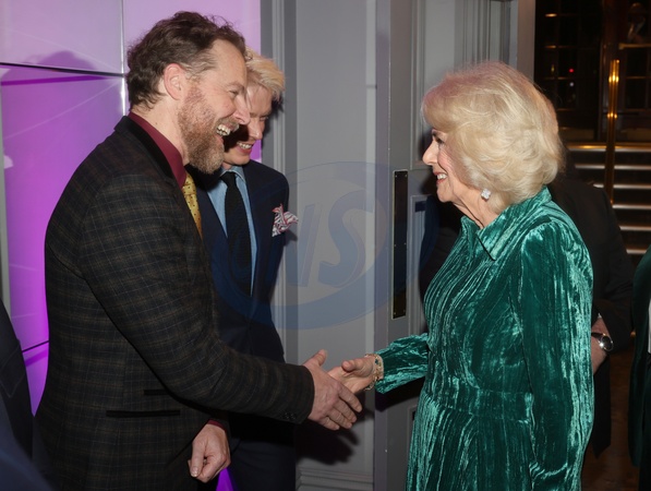 LONDON, ENGLAND - FEBRUARY 14: Queen Camilla smiles as she shakes hands with Samuel West at the "Celebration Of Shakespeare" at Grosvenor House on February 14, 2024 in London, England., Credit:Chris Jackson / Avalon