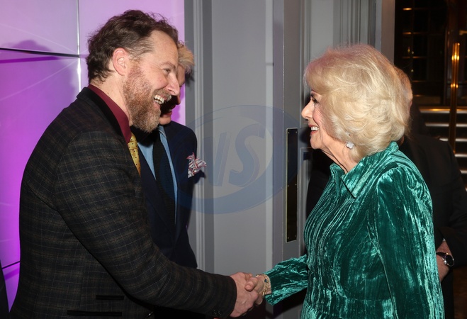 LONDON, ENGLAND - FEBRUARY 14: Queen Camilla smiles as she shakes hands with Samuel West at the "Celebration Of Shakespeare" at Grosvenor House on February 14, 2024 in London, England., Credit:Chris Jackson / Avalon