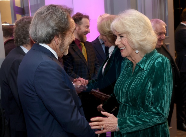 LONDON, ENGLAND - FEBRUARY 14: Queen Camilla smiles as she speaks with Robert Lindsay at the "Celebration Of Shakespeare" at Grosvenor House on February 14, 2024 in London, England., Credit:Chris Jackson / Avalon