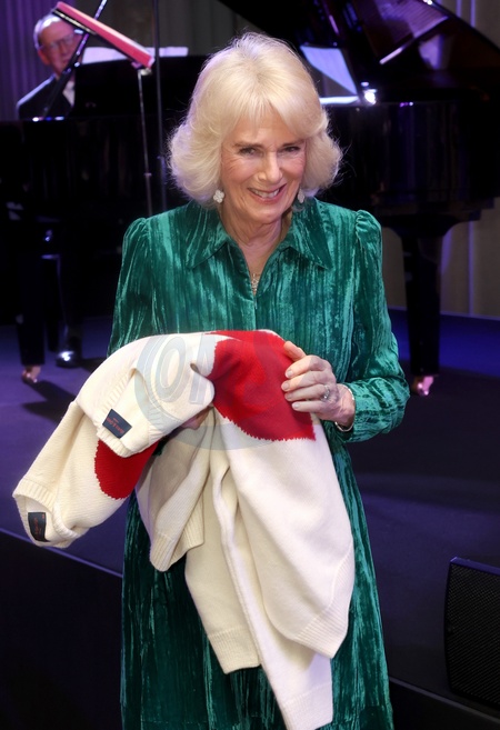 LONDON, ENGLAND - FEBRUARY 14: Queen Camilla smiles as she holds gifts of Valentine's Day jumpers with red hearts displayed on them, for herself and King Charles III at the "Celebration Of Shakespeare" at Grosvenor House on February 14, 2024 in London, England., Credit:Chris Jackson / Avalon