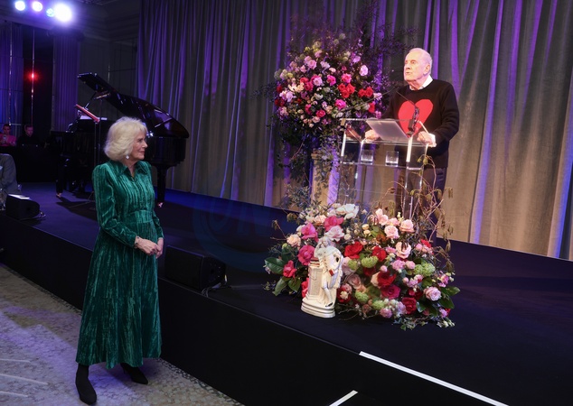 LONDON, ENGLAND - FEBRUARY 14: Queen Camilla smiles during a speech by host Gyles Brandreth as she attends the "Celebration Of Shakespeare" at Grosvenor House on February 14, 2024 in London, England., Credit:Chris Jackson / Avalon