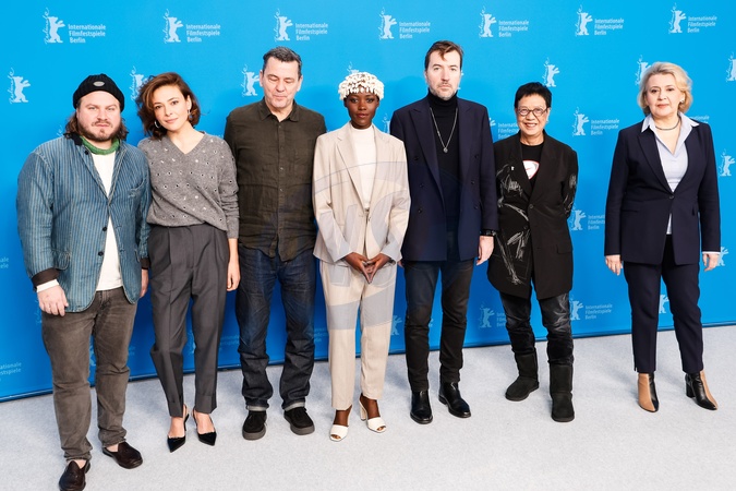 Brady Corbet, Jasmine Trinca, Christian Petzold, Lupita Nyong'o, Albert Serra, Ann Hui, Oksana Zabuzhko photographed at the Jury photocall during the 74th Berlinale International Film Festival at Hyatt Grand Hotel in Berlin, Germany on 15 Feburary 2024., Credit:John Rasimus / Avalon