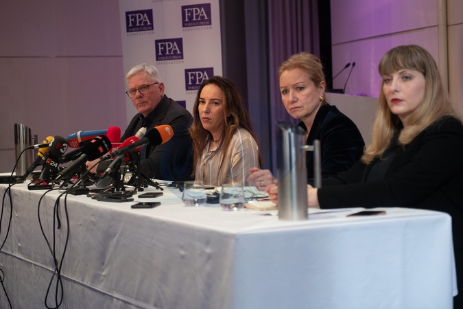 Stella Assange - wife of jailed Wikileaks founder Julian Assange, Wikileaks editor-in-chief Kristinn Hrafnsson (L) and Rebecca Vincent - Director of Campaigns for Reporters Without Borders (R) speaks at a Press conference about her husband's final appeal to happen next week - Royal Overseas League, London, England, UK on Thursday 15 February, 2024., Credit:Justin Ng / Avalon
