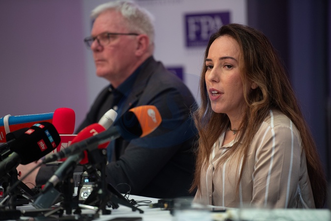 Stella Assange - wife of jailed Wikileaks founder Julian Assange, speaks at a Press conference about her husband's final appeal to happen next week - Royal Overseas League, London, England, UK on Thursday 15 February, 2024., Credit:Justin Ng / Avalon