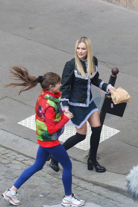 Semi-exclusif - Lily Collins et Camille Razat sur le tournage de la saison 4 de "Emily in Paris" sur Netflix à Paris
