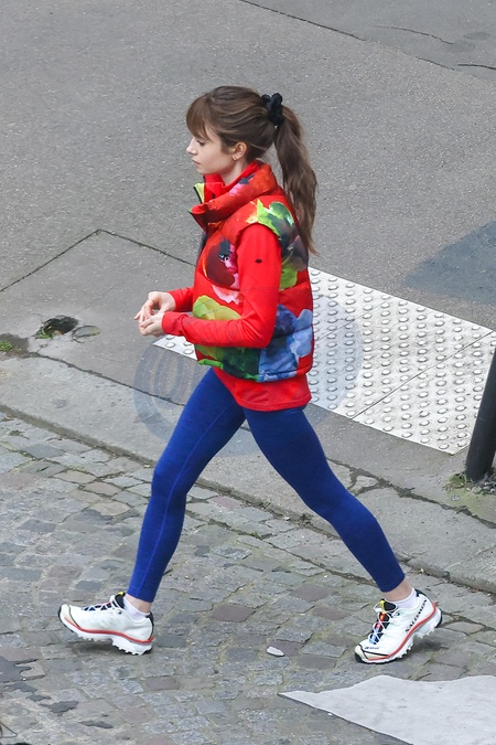 Semi-exclusif - Lily Collins sur le tournage de la saison 4 de "Emily in Paris" sur Netflix à Paris, France, le 15 février 2024. Filming of season 4 of "Emily in Paris” on Netflix in Paris, France, on February 15, 2024.