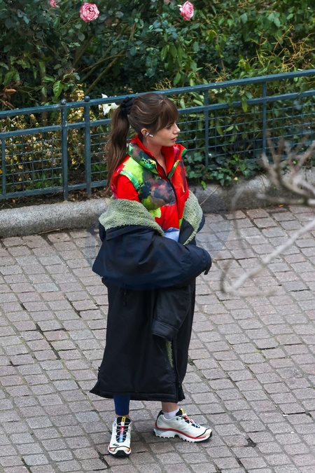 Semi-exclusif - Lily Collins sur le tournage de la saison 4 de "Emily in Paris" sur Netflix à Paris, France, le 15 février 2024. Filming of season 4 of "Emily in Paris” on Netflix in Paris, France, on February 15, 2024.