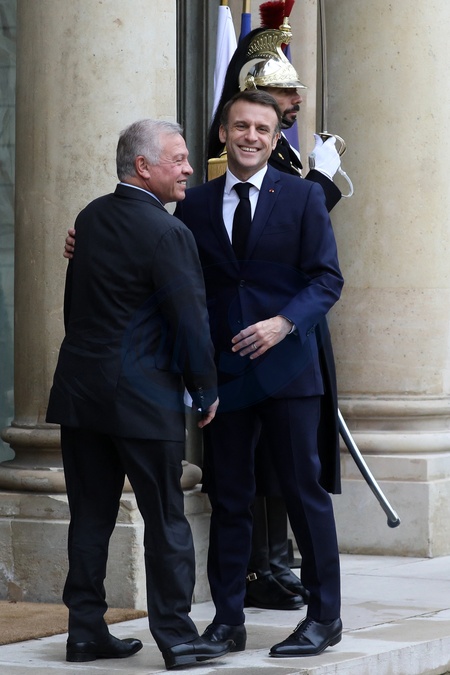 Prezydent Francji Emmanuel Macron przyjmuje króla Jordanii Abdullaha II na rozmowę w Pałacu Elizejskim w Paryżu