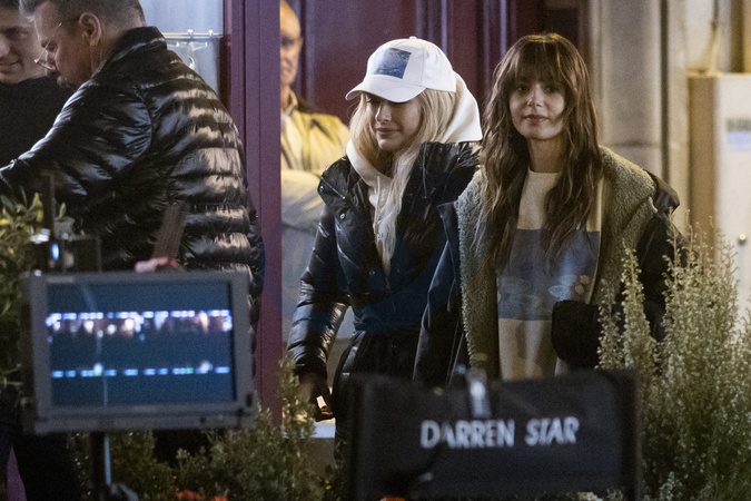 Exclusif - Prix Spécial - No Web - Camille Razat, Lily Collins Exclusive - For Germany call for price - Filming of season 4 of the Netflix series "Emily in Paris” on the Place de L'estrapade in Paris on february 15, 20224.
