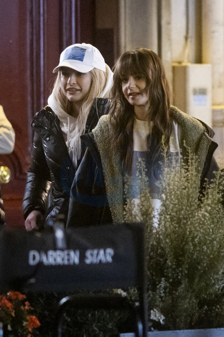 Exclusif - Prix Spécial - No Web - Camille Razat, Lily Collins Exclusive - For Germany call for price - Filming of season 4 of the Netflix series "Emily in Paris” on the Place de L'estrapade in Paris on february 15, 20224.