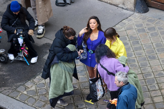 Semi-exclusif - Première apparition de l'actrice Ashley Park, depuis son hospitalisation pour un choc septique, pendant le tournage de la saison 4 de série Netflix "Emily in Paris" avec la co-star Lily Collins dans les rues de Paris, France, le 16 février 2024. L'interprète de Mindy Chen est tombée gravement malade pendant ses vacances de fin d'année aux Maldives. Elle a été en convalescence à Paris avant de reprendre le tournage de la série. No Web pour la Belgique et la Suisse Semi-Exclusive - Actress Ashley Park's first appearance, since being hospitalized for septic shock, during the filming of season 4 of Netflix series "Emily in Paris" with co-star Lily Collins on the streets of Paris, France, on February 16 2024. The interpreter of Mindy Chen fell seriously ill during her end-of-year vacation in the Maldives. She was convalescing in Paris before resuming filming the series.