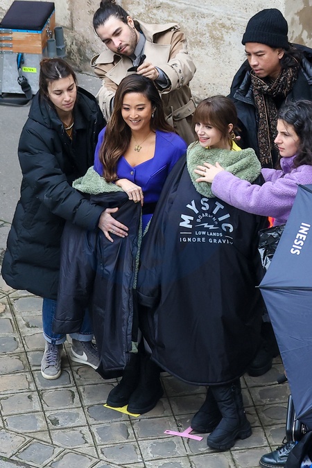 Semi-exclusif - Première apparition de l'actrice Ashley Park, depuis son hospitalisation pour un choc septique, pendant le tournage de la saison 4 de série Netflix "Emily in Paris" avec la co-star Lily Collins dans les rues de Paris, France, le 16 février 2024. L'interprète de Mindy Chen est tombée gravement malade pendant ses vacances de fin d'année aux Maldives. Elle a été en convalescence à Paris avant de reprendre le tournage de la série. No Web pour la Belgique et la Suisse Semi-Exclusive - Actress Ashley Park's first appearance, since being hospitalized for septic shock, during the filming of season 4 of Netflix series "Emily in Paris" with co-star Lily Collins on the streets of Paris, France, on February 16 2024. The interpreter of Mindy Chen fell seriously ill during her end-of-year vacation in the Maldives. She was convalescing in Paris before resuming filming the series.