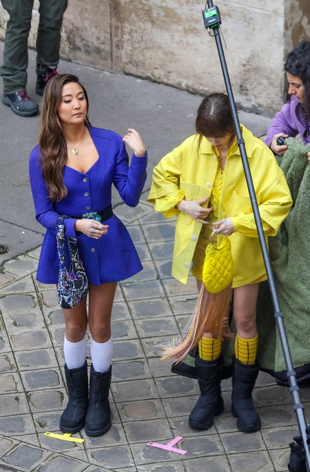 Semi-exclusif - Première apparition de l'actrice Ashley Park, depuis son hospitalisation pour un choc septique, pendant le tournage de la saison 4 de série Netflix "Emily in Paris" avec la co-star Lily Collins dans les rues de Paris