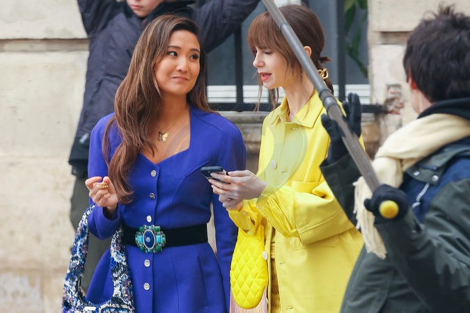 Semi-exclusif - Première apparition de l'actrice Ashley Park, depuis son hospitalisation pour un choc septique, pendant le tournage de la saison 4 de série Netflix "Emily in Paris" avec la co-star Lily Collins dans les rues de Paris, France, le 16 février 2024. L'interprète de Mindy Chen est tombée gravement malade pendant ses vacances de fin d'année aux Maldives. Elle a été en convalescence à Paris avant de reprendre le tournage de la série. No Web pour la Belgique et la Suisse Semi-Exclusive - Actress Ashley Park's first appearance, since being hospitalized for septic shock, during the filming of season 4 of Netflix series "Emily in Paris" with co-star Lily Collins on the streets of Paris, France, on February 16 2024. The interpreter of Mindy Chen fell seriously ill during her end-of-year vacation in the Maldives. She was convalescing in Paris before resuming filming the series.